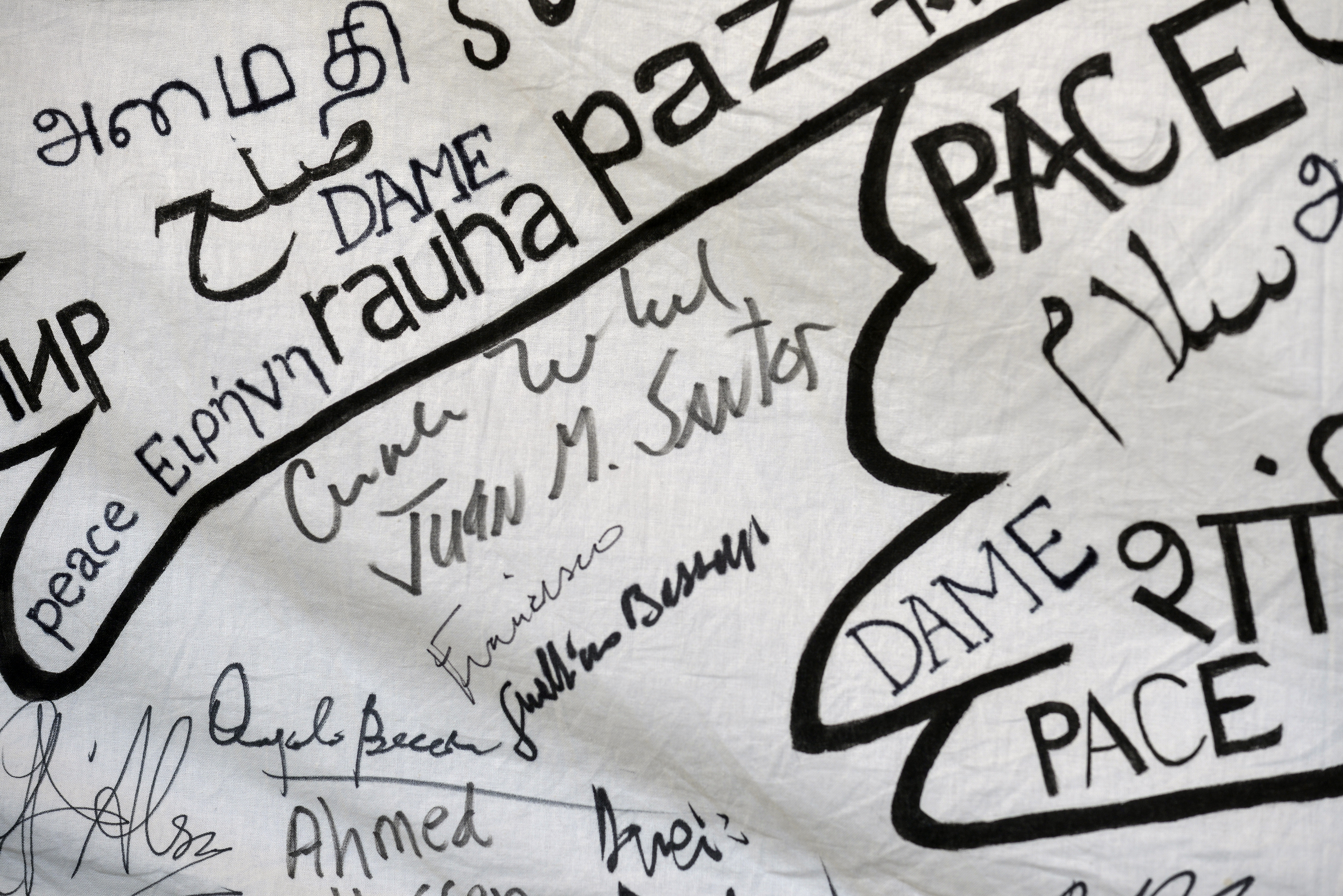 Angela Merkel e il presidente Santos firmano la Bandiera della Pace di Auxilium