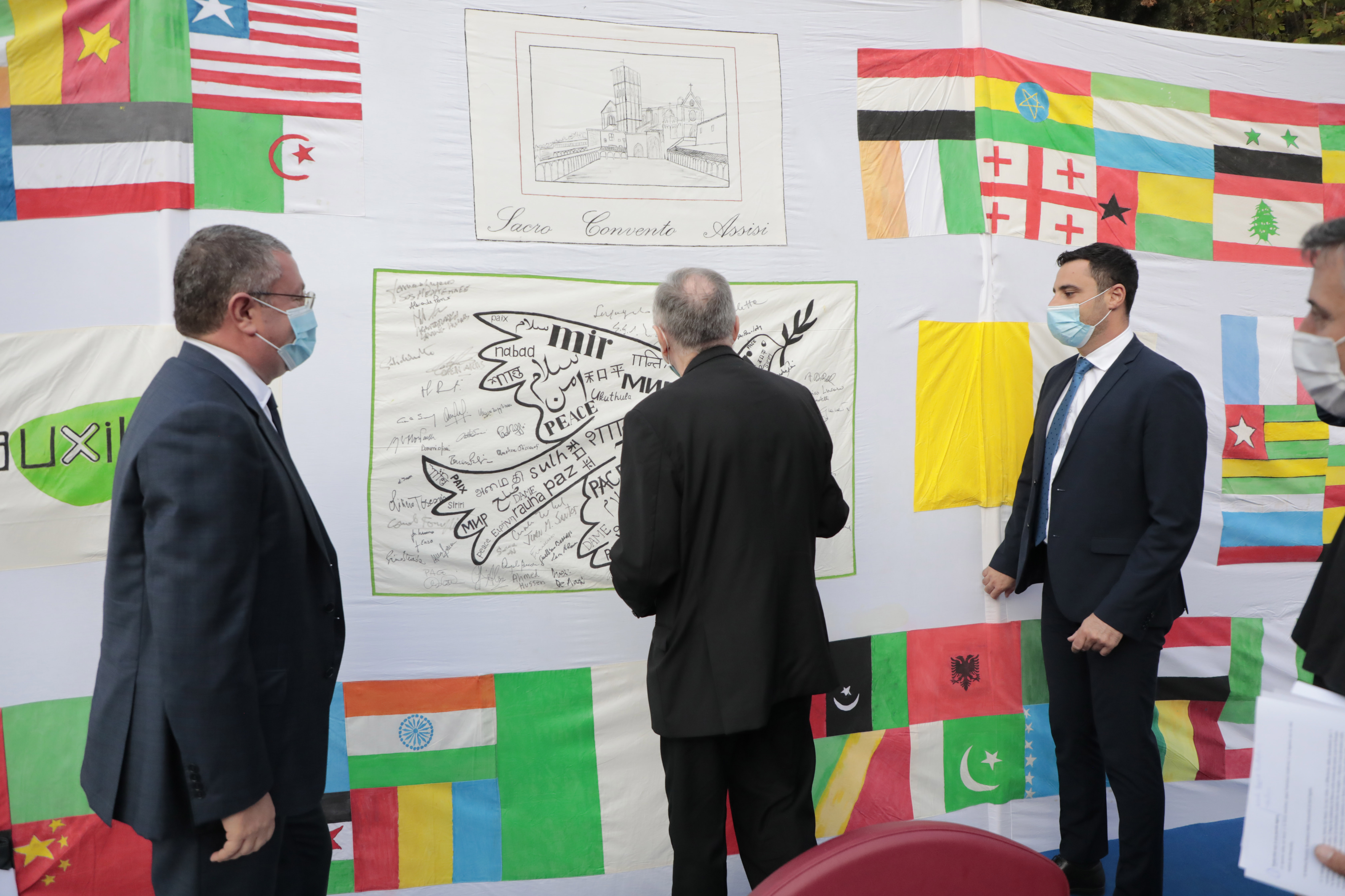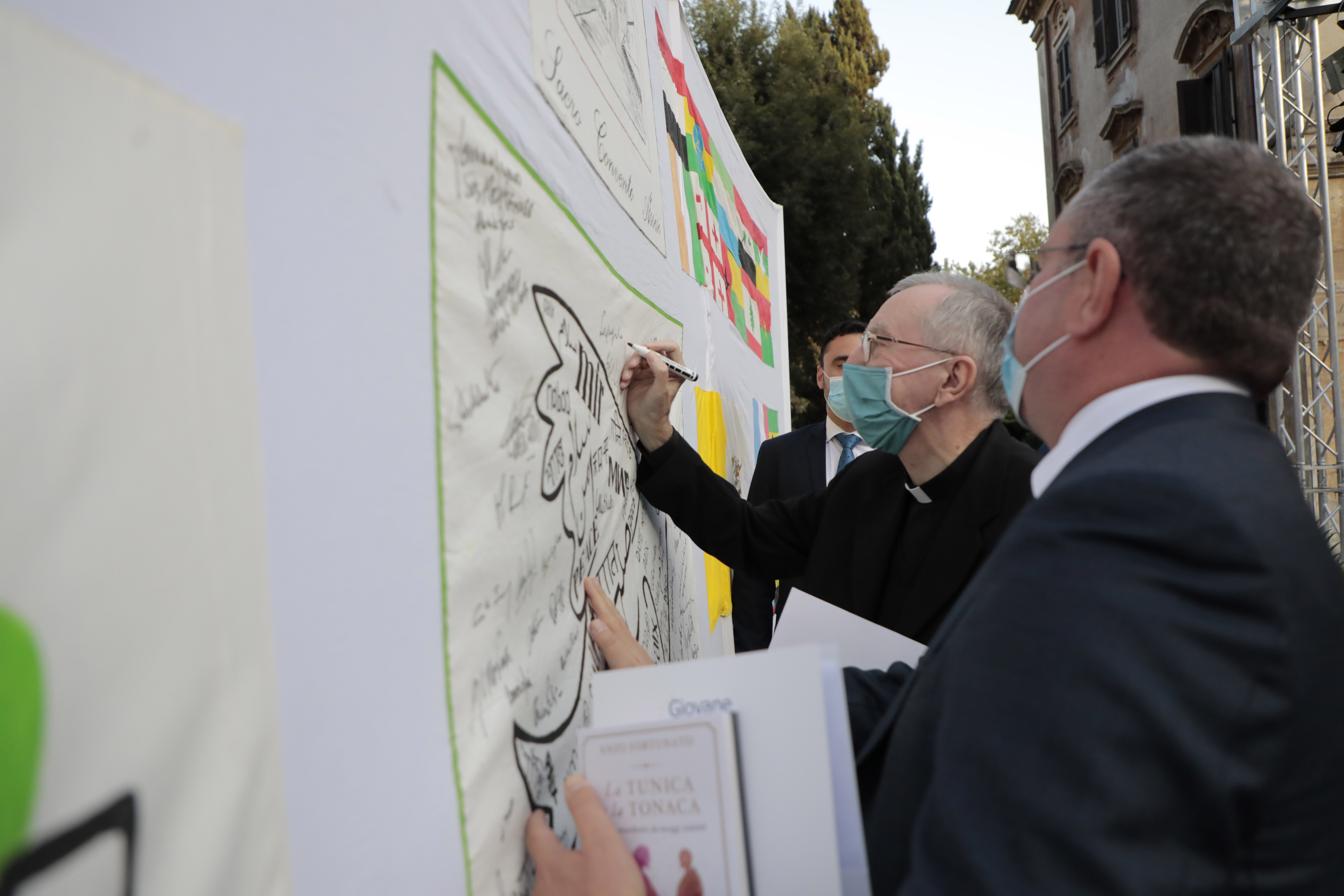 Il Segretario di Stato Pietro Parolin, dopo aver firmato la Bandiera della Pace Auxilium, con la sua proverbiale semplicità e chiarezza, ha emozionato la platea: “Quello che ci offre padre Enzo è una suggestione spirituale, non si tratta semplicemente della comparazione tra due abiti, la tunica di Cristo e la tonaca di san Francesco, quanto la sottolineatura di una affinità che unisce il Maestro e Francesco, che del Maestro è fedele discepolo e un innamorato. Da qui deriva un d’indicazione che può essere valida per la società, per la chiesa, per la politica, per ogni uomo, cioè che dobbiamo essere degli innamorati che hanno a cuore la vocazione che sono chiamati a vivere”. Ha aggiunto il Cardinale Parolin: “Spogliarsi per rivestirsi, per condurre una vita nuova, secondo logiche nuove, una vita che si traduce in stili nuovi di comportamento e di condotta. La situazione che ci troviamo a vivere, con la pandemia che ha provocato tanto disorientamento, ci costringe a cogliere questa opportunità. Perché, come ha detto Papa Francesco, da questa crisi si esce migliori o peggiori”.