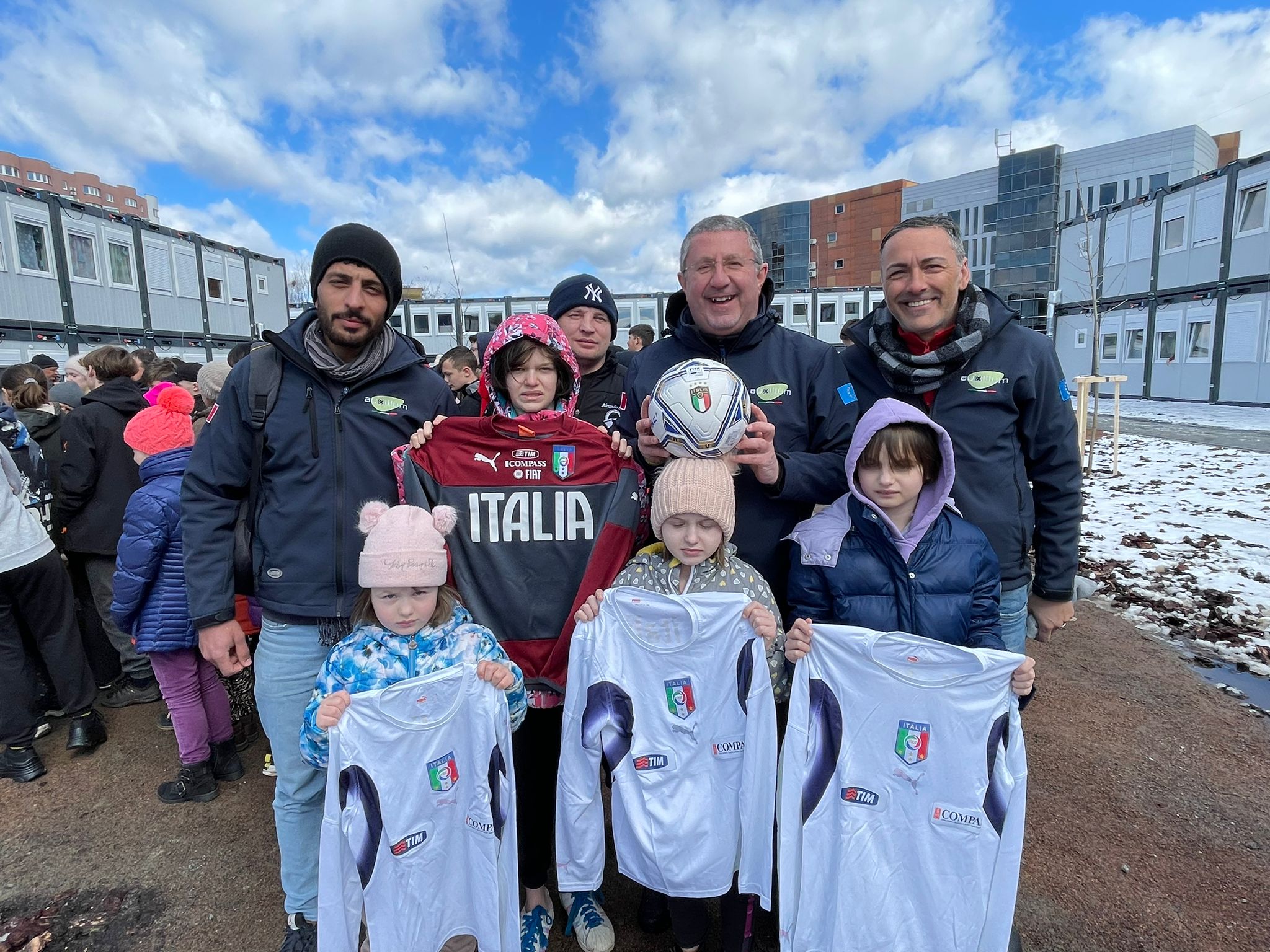Dopo una visita alla Comunità francescana di Leopoli, è proprio dall’Ospedale che è iniziata la giornata della Missione umanitaria “L’Italia scende in campo per la Pace”. Lì padre Enzo Fortunato, Angelo Chiorazzo, Adriano Roccucci di Sant’Egidio, Domenico Alagia, Francesco Molfese, Ahmed Taha e gli altri hanno distribuito ai bambini libri, maglie, tute e felpe della Nazionale di calcio, soffermandosi con tante persone ricoverate e sono rimasti profondamente colpiti dai loro racconti e dalla loro umanità: persone semplici, vittime di una guerra insensata. Come un ingegnere ucraino, che lavora per una società italiana, al quale è stata amputata una gamba a causa di una bomba; o un ragazzo, che dopo mesi cerca ancora di riprendersi dalle torture subite durante la prigionia: faceva, infatti, parte della guarnigione di stanza sull’Isola dei Serpenti, nel mar Nero, che fu catturata dalla marina russa il primo giorno dell’invasione. Si resta senza parole di fronte alla brutalità della guerra, specie quando si incontra una vittima. Vittime come le famiglie che hanno perso tutto, e che dopo essere state sfollate sono state accolte nei prefabbricati del quartiere di Sikhiv. Difficile descrivere l’entusiasmo e la gioia che ha accolto la Missione umanitaria, con gli aiuti, i libri e il materiale della Nazionale donato dalla FIGC: una grande festa per tutti!