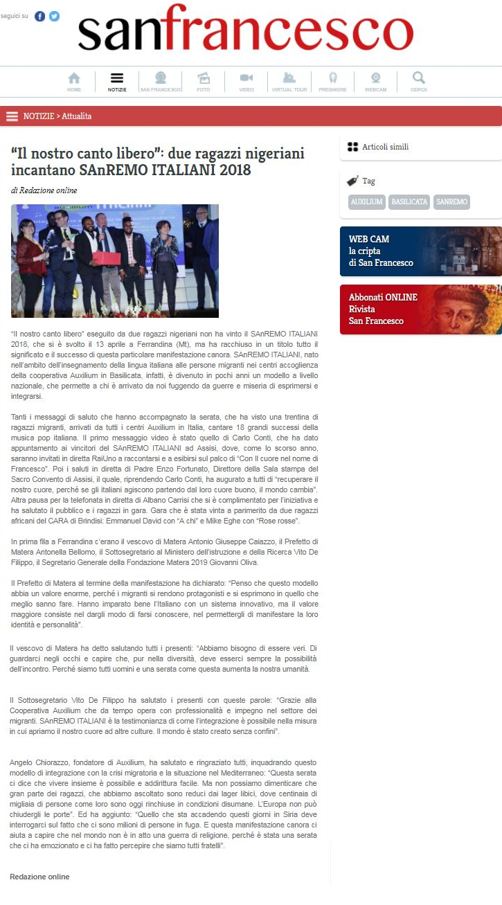 Nonostante “Il mio canto libero”, eseguito da due ragazzi nigeriani, non abbia vinto questa terza edizione di SAnREMO ITALIANI, in sé ha racchiuso tutto il significato di questa particolare manifestazione canora. SAnREMO ITALIANI è nata nell'ambito dell’insegnamento della lingua italiana alle persone migranti nei centri accoglienza Auxilium in Basilicata ma, in pochi anni, è diventata un modello a livello nazionale. Questa modalità di insegnamento della lingua permette, a chi è arrivato nei centri Auxilium, fuggendo da guerre e miseria, di esprimersi e di integrarsi. Tanti i messaggi di saluto che hanno accompagnato questa serata straordinaria che ha visto una trentina di ragazzi migranti, arrivati da tutti i centri Auxilium in Italia, cantare 18 grandi successi della musica pop italiana. Il primo messaggio video è stato quello di Carlo Conti, che ha dato appuntamento ai vincitori del SAnREMO ITALIANI ad Assisi, dove, come lo scorso anno, saranno invitati in diretta RaiUno a raccontarsi e a esibirsi sul palco di “Con Il cuore nel nome di Francesco”. Poi i saluti in diretta di Padre Enzo Fortunato, Direttore della Sala stampa del Sacro Convento di Assisi, il quale,ha augurato a tutti di “recuperare il nostro cuore, perché se gli italiani agiscono partendo dal loro cuore buono, il mondo cambia”. Altra pausa per la telefonata in diretta di Albano Carrisi che si è complimentato per l’iniziativa e ha salutato il pubblico e i ragazzi in gara. Gara vinta a pari merito da due ragazzi africani del CARA di Brindisi: Emmanuel David con “A chi” e Mike Eghe con “Rose rosse”. In prima fila a Ferrandina c’erano il vescovo di Matera Antonio Giuseppe Caiazzo, il Prefetto di Matera Antonella Bellomo, il Sottosegretario al Ministero dell’Istruzione e della Ricerca Vito De Filippo, il Segretario Generale della Fondazione Matera 2019 Giovanni Oliva. Il Prefetto al termine della manifestazione ha dichiarato: “Penso che questo modello abbia un valore enorme, perché i migranti si rendono protagonisti e si esprimono in quello che meglio sanno fare. Hanno imparato bene l’Italiano con un sistema innovativo, ma il valore maggiore consiste nel dargli modo di farsi conoscere, nel permettergli di manifestare la loro identità e personalità”. Il vescovo di Matera ha detto salutando tutti i presenti: “Abbiamo bisogno di essere veri. Di guardarci negli occhi e capire che, pur nella diversità, deve esserci sempre la possibilità dell’incontro. Perché siamo tutti uomini e una serata come questa aumenta la nostra umanità. Il Sottosegretario Vito De Filippo ha salutato i presenti con queste parole: “Grazie alla Cooperativa Auxilium che da tempo opera con professionalità e impegno nel settore dei migranti. SAnREMO ITALIANI è la testimonianza di come l’integrazione è possibile nella misura in cui apriamo il nostro cuore ad altre culture. Il mondo è stato creato senza confini”. Angelo Chiorazzo ha ringraziato collegando questo modello di integrazione con la crisi migratoria e la situazione nel Mediterraneo: “Questa serata ci dice che vivere insieme è possibile e addirittura facile. Ma non possiamo dimenticare che gran parte dei ragazzi che abbiamo ascoltato sono reduci dai lager libici, dove centinaia di migliaia di persone come loro sono oggi rinchiuse in condizioni disumane. L’Europa non può chiudergli le porte”. Ed ha aggiunto: “Quello che sta accadendo in Siria deve interrogarci sul fatto che ci sono milioni di persone in fuga. E questa manifestazione canora ci aiuta a capire che nel mondo non è in atto una guerra di religione: ce lo fa capire attraverso le emozioni che trasmette e attraverso la percezione che siamo tutti fratelli”.