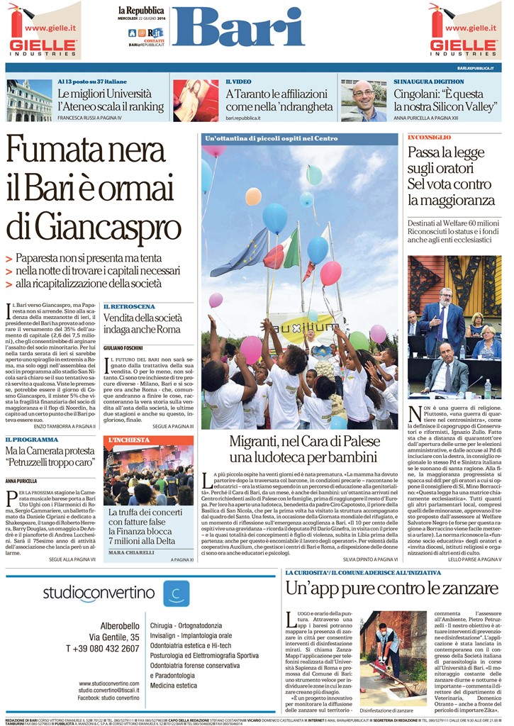 L'articolo della Repubblica di Bari sulla bellissima Giornata mondiale del Rifugiato vissuta al CARA di Bari Palese in un clima di festa per i bambini. Le parole di padre Ciro Capotosto, rettore della Basilica di San Nicola accolto al CARA da Angelo Chiorazzo e Michelangelo Armenise, quelle dell'onorevole Dario Ginefra, del vicedirettore del CARA Angelo Colangelo e di Rita Di Nino, responsabile del settore sociopsicologico.