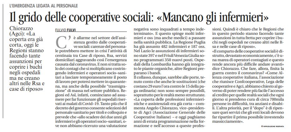 Angelo Chiorazzo, fondatore della Cooperativa Auxilium, denuncia la mancanza di personale sanitario nelle RSA, per l'Assistenza Domiciliare Integrata e le case di riposo. Appello al Governo.