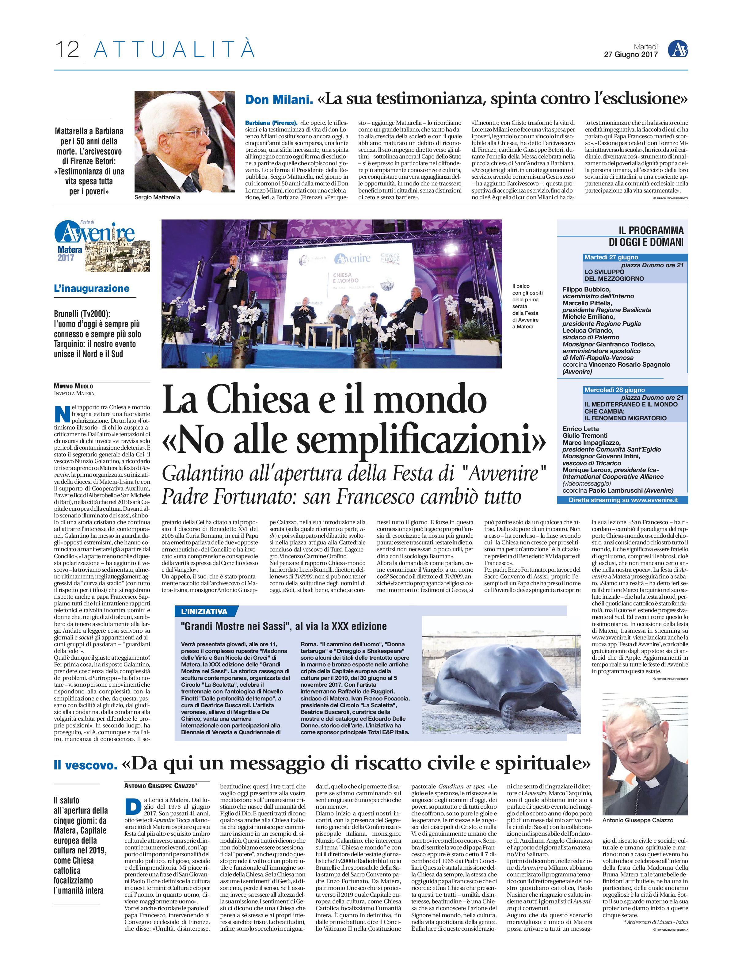 La Festa di Avvenire si è aperta con un’approfondita riflessione sul rapporto tra Chiesa e Mondo. A discuterne sul palco il Segretario generale della C.E.I. monsignor Nunzio Galantino, il direttore di TV2000 Lucio Brunelli, padre Enzo Fortunato, direttore della rivista San Francesco d'Assisi e a concludere è stato mons. Vincenzo Orofino vescovo della Diocesi di Tursi-Lagonegro.