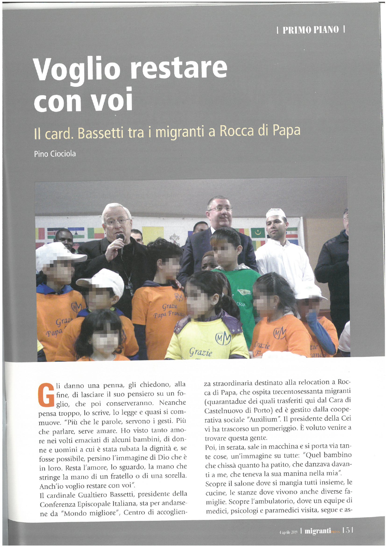 La bellissima copertina del nuovo numero di Migranti, mensile della fondazione Migrantes, in cui c'è la foto del cardinale Gualtiero Bassetti con i ragazzi di Mondo Migliore, durante la sua visita al centro. Nel numero, a pagina 5 e 6 c'è un bellissimo articolo di Pino Ciociola sul pomeriggio passato dal cardinale Gualtiero Bassetti, Presidente della Conferenza Episcopale Italiana, al centro Mondo Migliore a Rocca di Papa: "Più che le parole, servono gesti. Più che parlare,serve amare. Ho visto tanto amore nei volti emanciati di alcuni bambini, di donne e uomini a cui è stata rubata la dignità e, se fosse possibile, persino l'immagine di Dio che è in loro. Resta l'amore, lo sguardo, la mano che stringe la mano di un fratello o di una sorella. Anch'io voglio restare con voi".