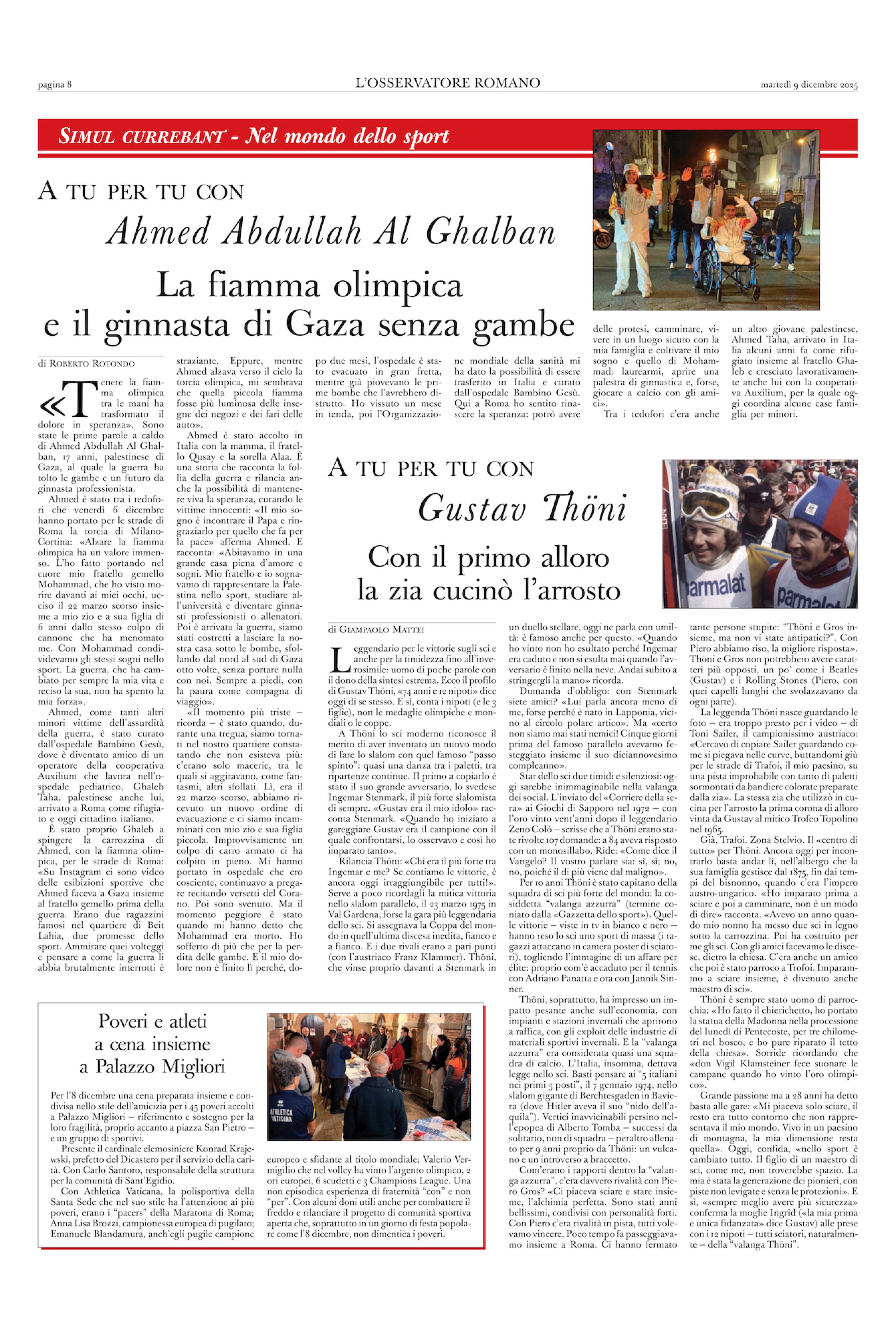 Il quotidiano della Santa Sede ha dedicato la sua pagina sportiva alla storia di Ahmed Abdullah Al Ghalban, ragazzo palestinese di 17 anni, rimasto gravemente mutilato a causa di una bomba, il quale ha portato la Fiamma Olimpica per le strade di Roma in carrozzina, spinto da un operatore della Cooperativa Auxilium suo amico